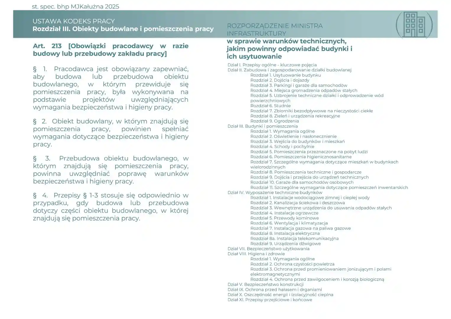 Prezentacja wymagań prawnych i obowiązków pracodawcy odnośnie budynków i pomieszczeń w zakładzie pracy.