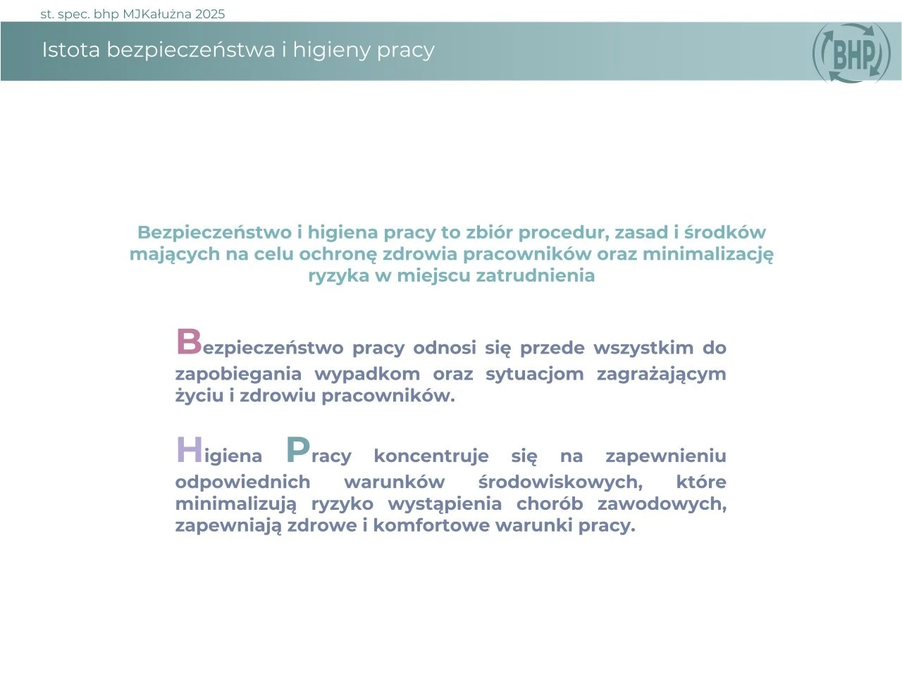 Slajd szkoleniowy na temat istoty bezpieczeństwa i higieny pracy.