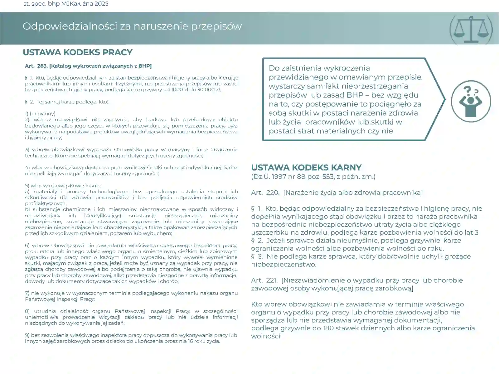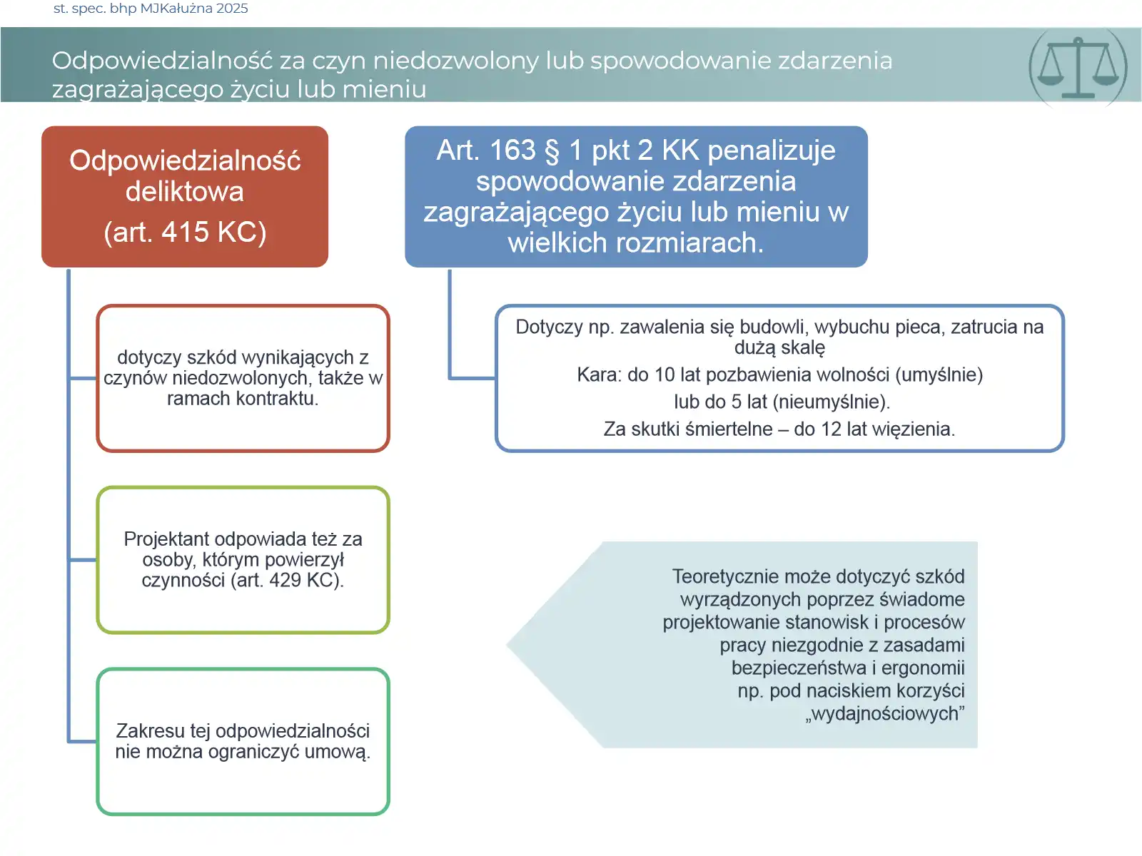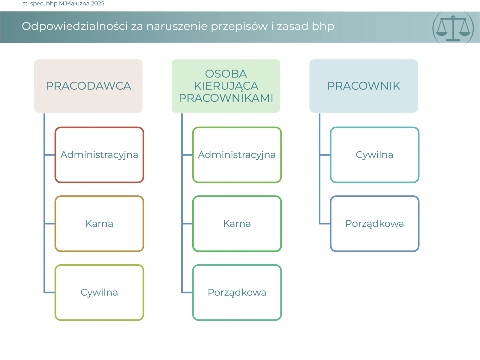 Krótko przedstawia sankcje mogące spotkać pracodawcę, osoby kierujące pracownikami, jak również samych pracowników w przypadku naruszenia przez nich przepisów dotyczących bhp. Prezentacja została poszerzona o kwestie odpowiedzialności konstruktorów, projektantów i technologów.