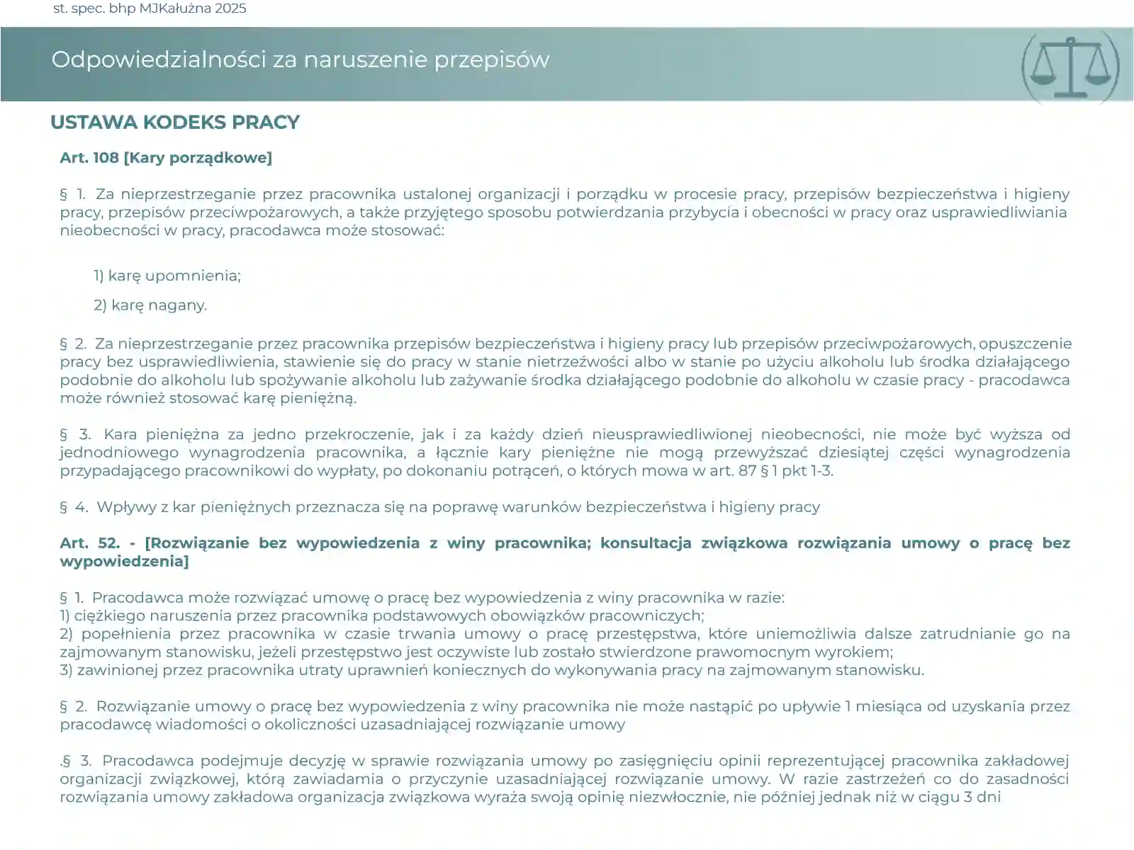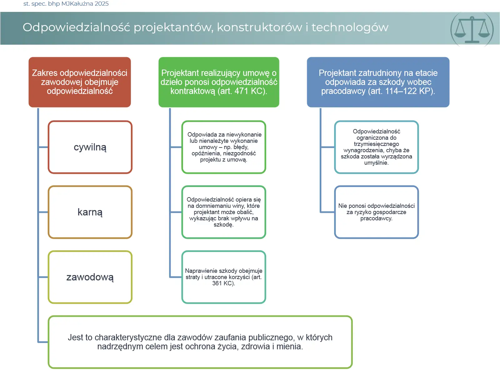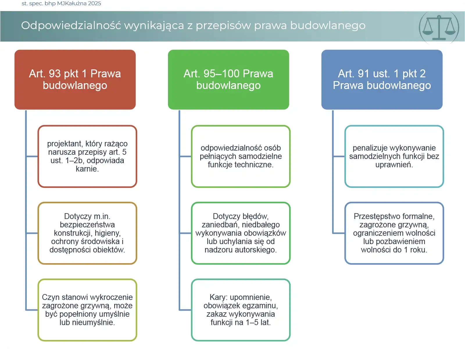 Krótko przedstawia sankcje mogące spotkać pracodawcę, osoby kierujące pracownikami, jak również samych pracowników w przypadku naruszenia przez nich przepisów dotyczących bhp. Prezentacja została poszerzona o kwestie odpowiedzialności konstruktorów, projektantów i technologów.