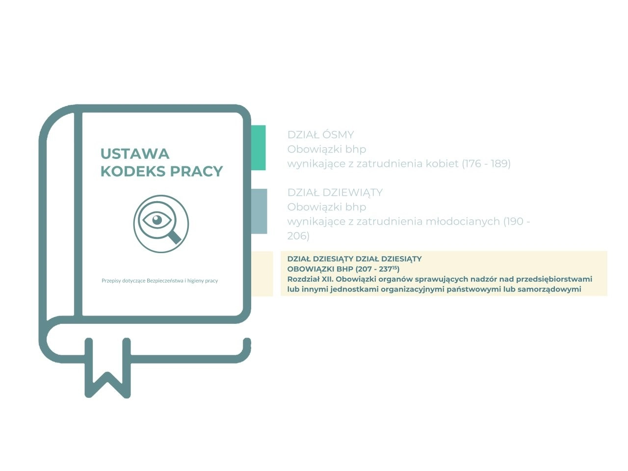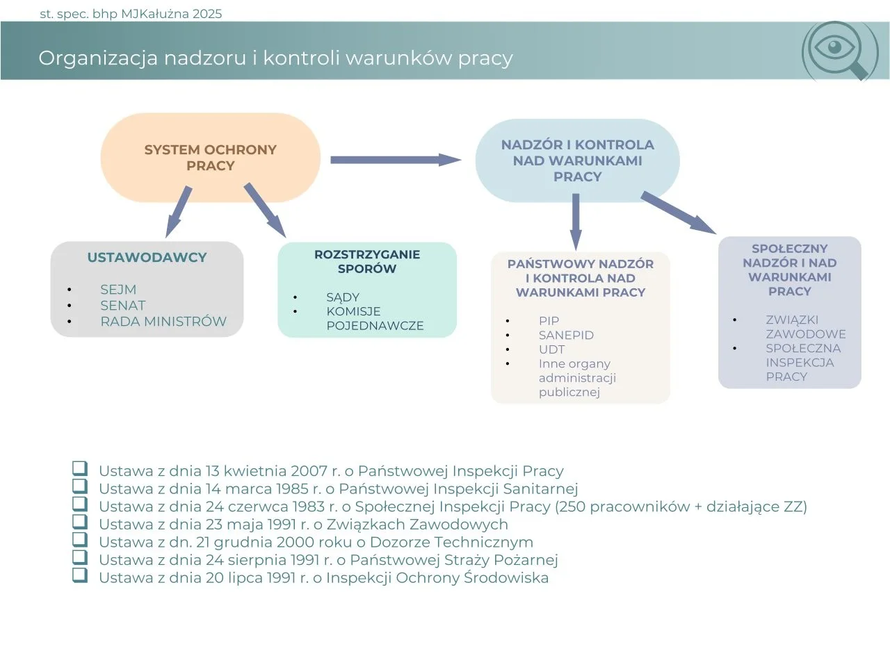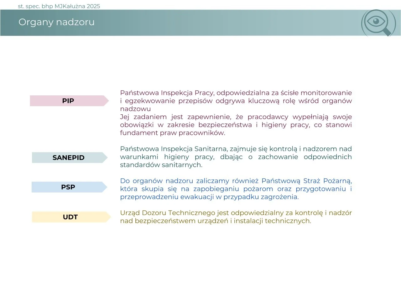 Przydatne narzędzie do prowadzenia szkoleń okresowych bhp, prezentujące organy powołane do kontroli warunków bhp w przedsiębiorstwach.