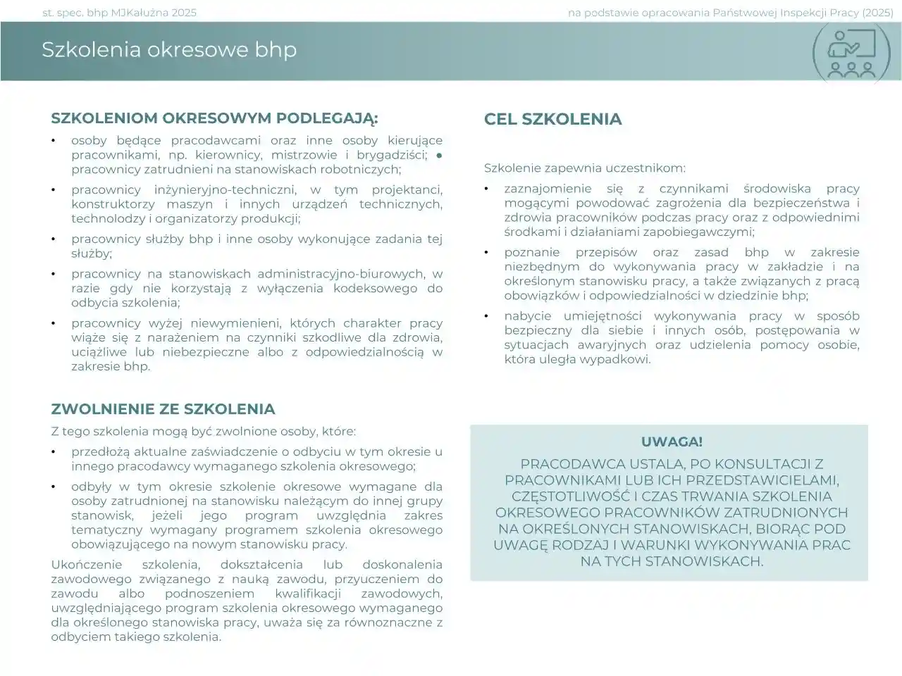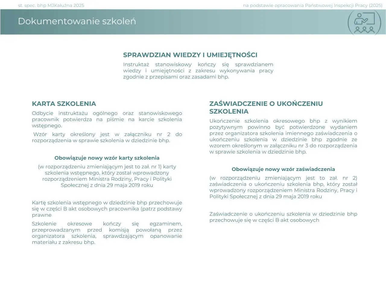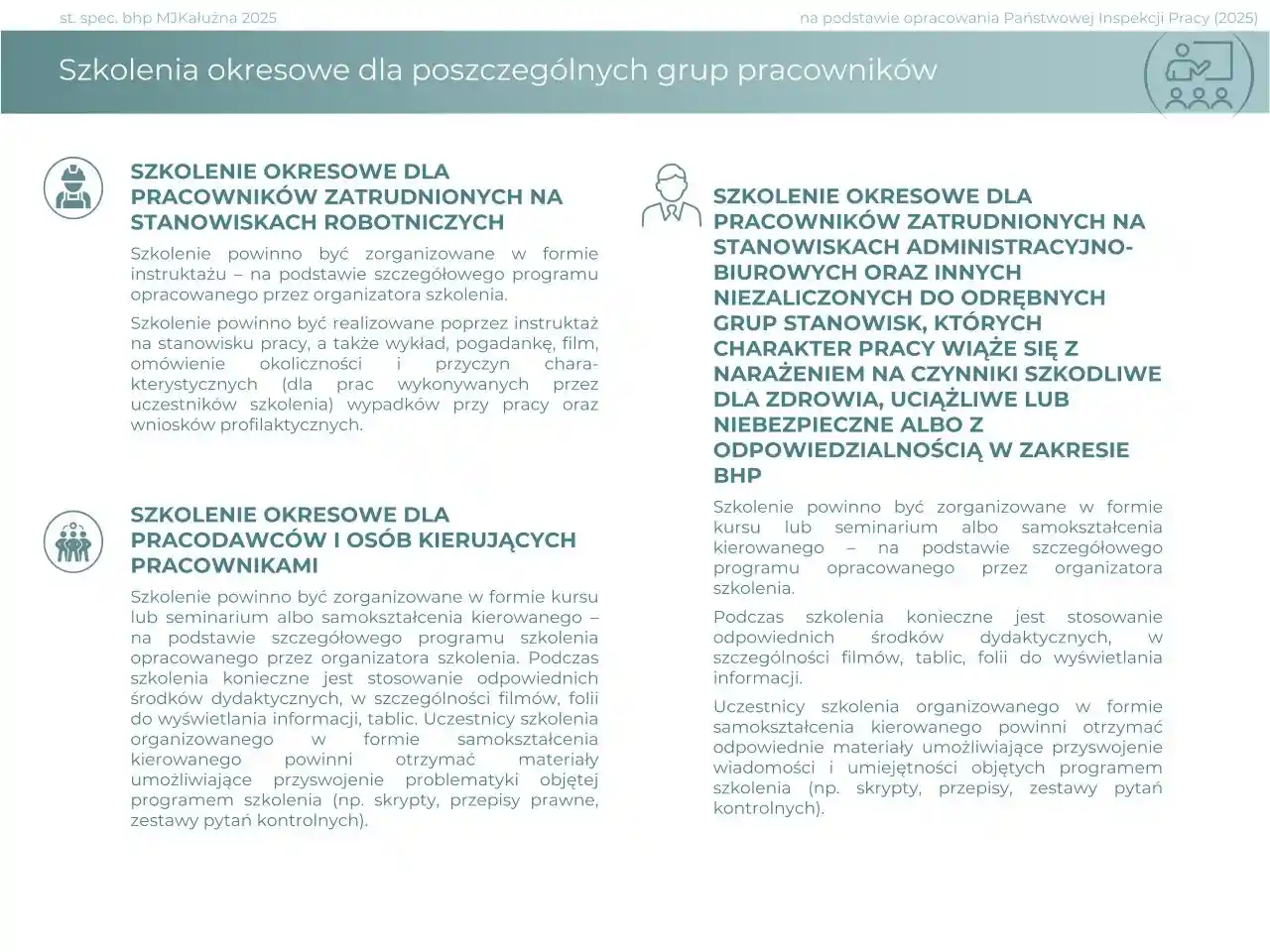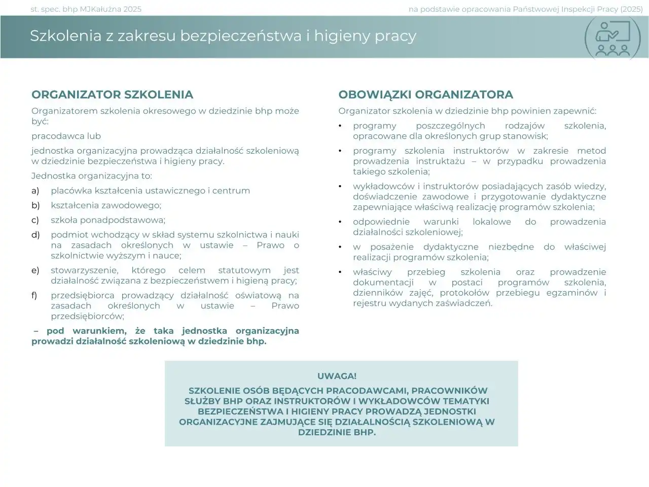 Może służyć również jako samodzielny materiał informacyjny na temat rodzajów szkoleń, sposobu i częstotliwości ich prowadzenia, jak również dokumentacji szkoleniowej i sposobu zarządzania dokumentami w przedsiębiorstwie.
