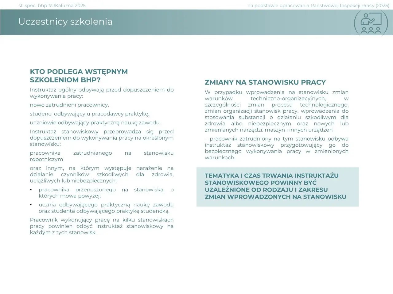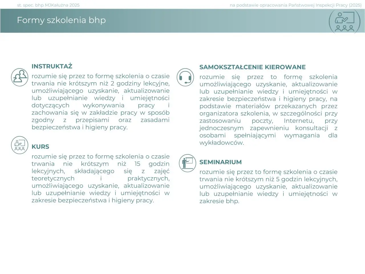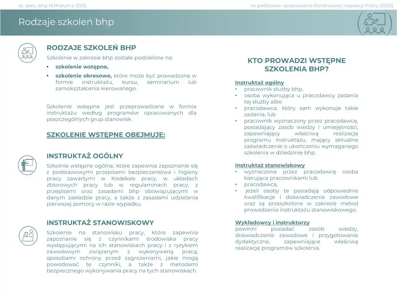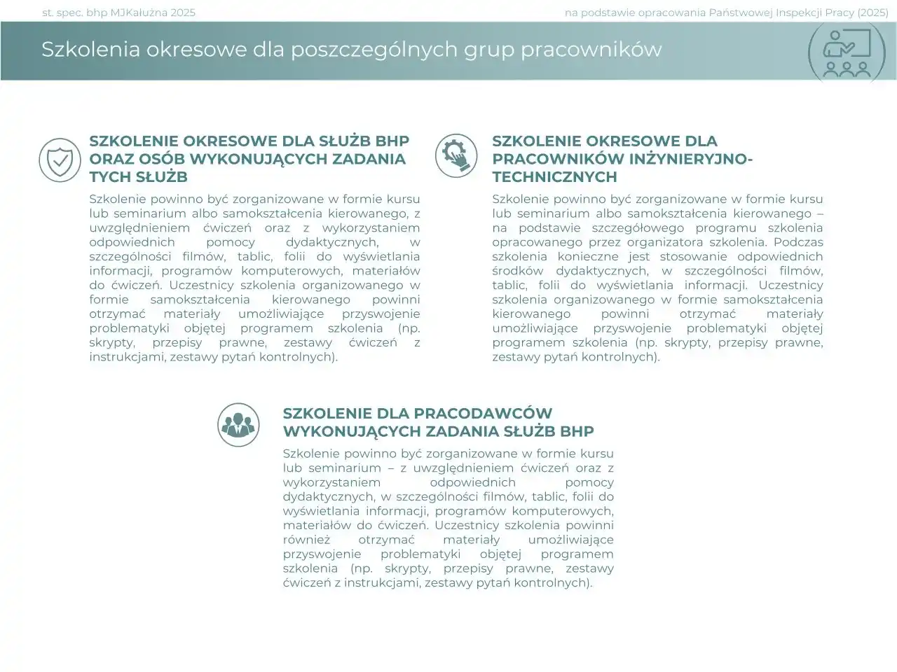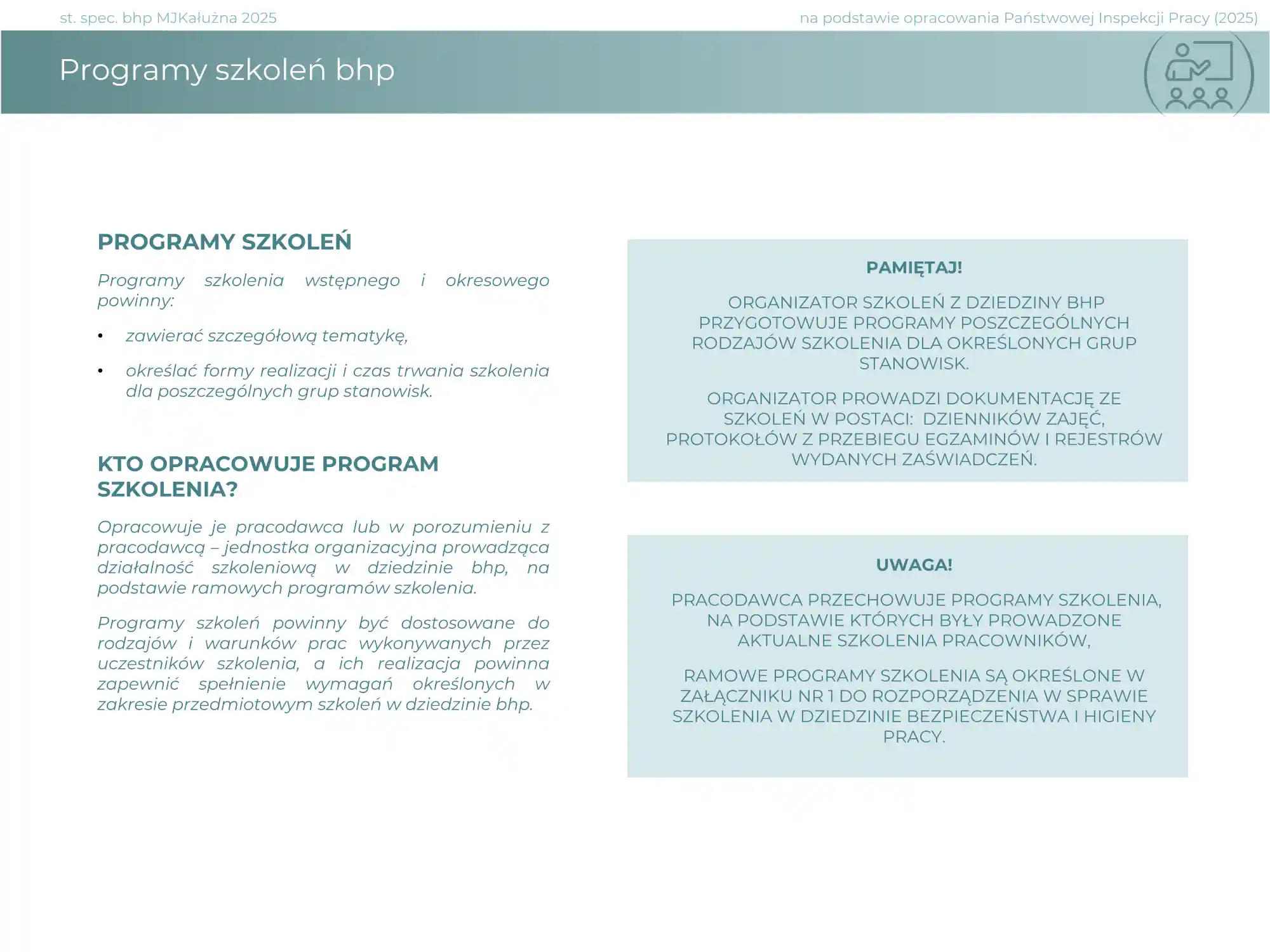 Może służyć również jako samodzielny materiał informacyjny na temat rodzajów szkoleń, sposobu i częstotliwości ich prowadzenia, jak również dokumentacji szkoleniowej i sposobu zarządzania dokumentami w przedsiębiorstwie.